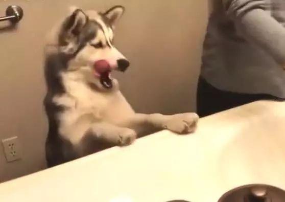 二哈看到主人在刷牙,以为在偷吃东西,舔了一口牙膏后表情亮了